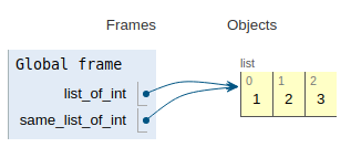 Тут мы создали объект в памяти [1, 2, 3] и дали ему названиеlist_of_int. Далее мы присвоили объекту под названием list_of_int ещё одно название - same_list_of_int. Теперь у нас есть два названия для одного объекта [1, 2, 3] , и обращаться к нему и изменять его мы можем используя любое из них. Стоит твердо уяснить, что изменяя list_of_int мы не меняем same_list_of_int, мы меняем объект [1, 2, 3] , а его новое состояние мы можем увидеть используя любое из его имен.