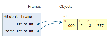 out: list_of_int: [1000, 2, 3, 777], same_list_of_int: [1000, 2, 3, 777]